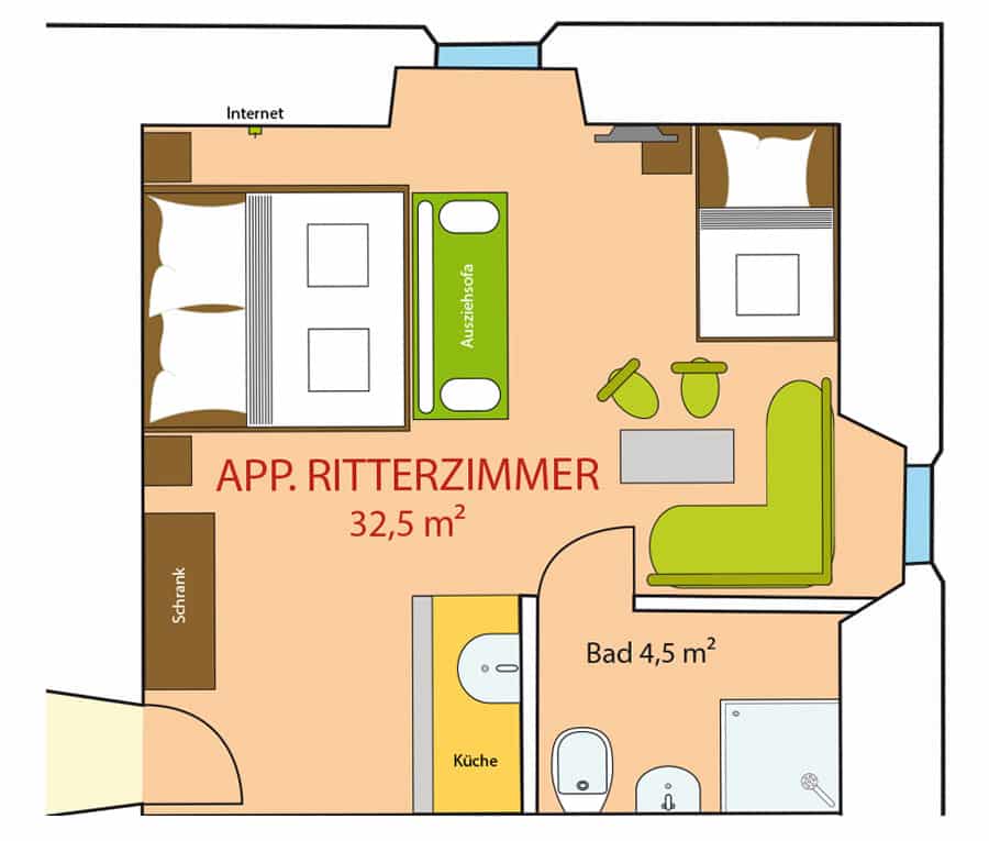 Barrierefreier Grundriss: Zirbenstube, Ritterzimmer, Lift, Vorhaus und Stiegenhaus im Schloss Saalhof